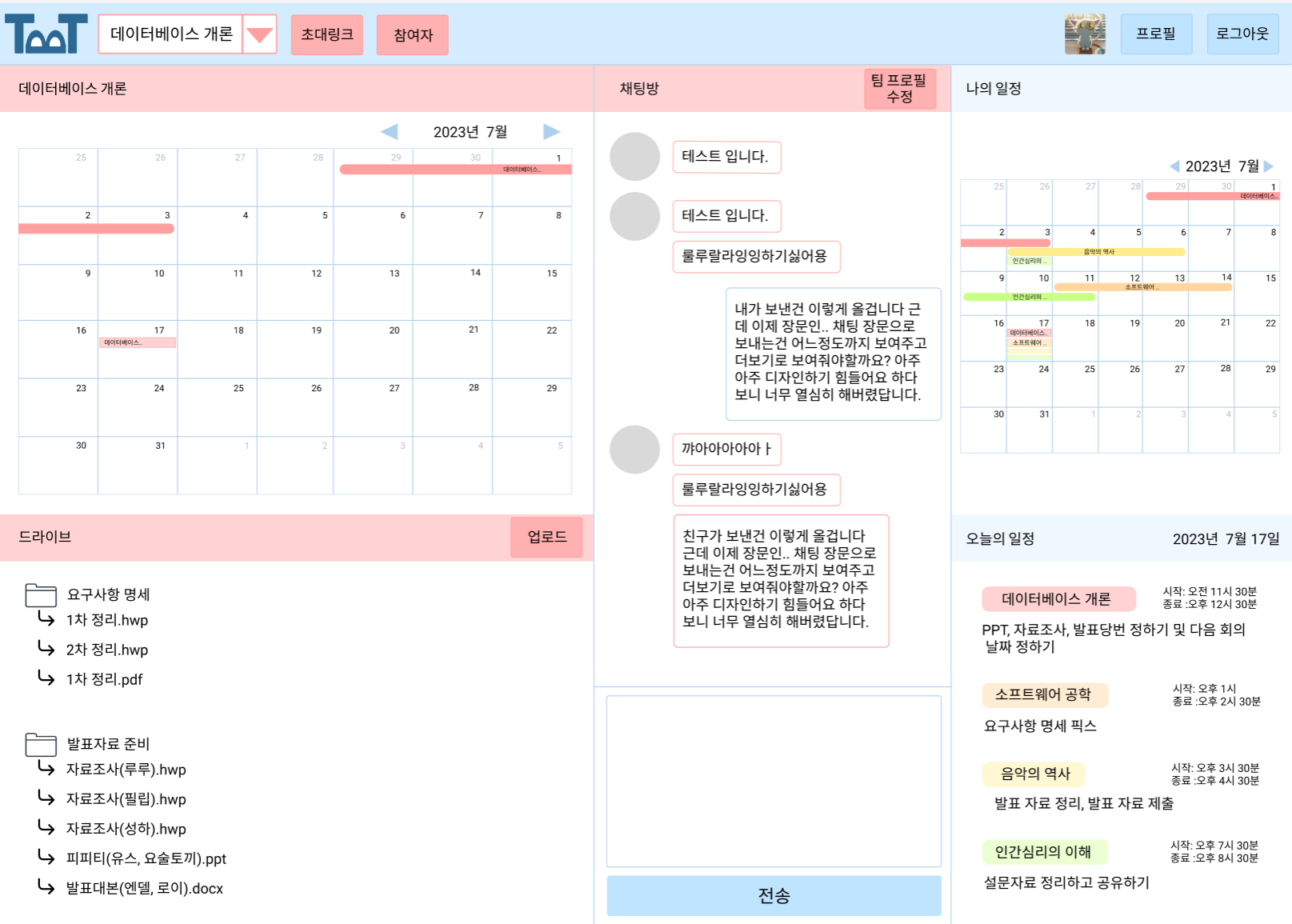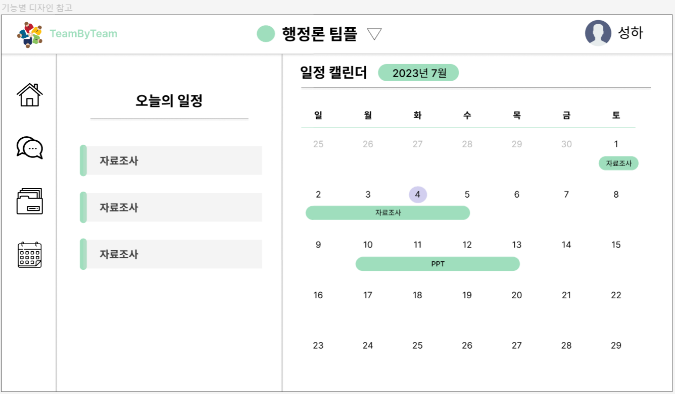 이건 성하가 만들어온거다. 왼쪽 사이드 메뉴바와 각 탭에서 보여질 화면은 이것처럼 디자인 하기로 했다. 오늘의 일정은 모아보기 페이지와 동일하게 오른쪽 사이드로 붙을 예정이다.