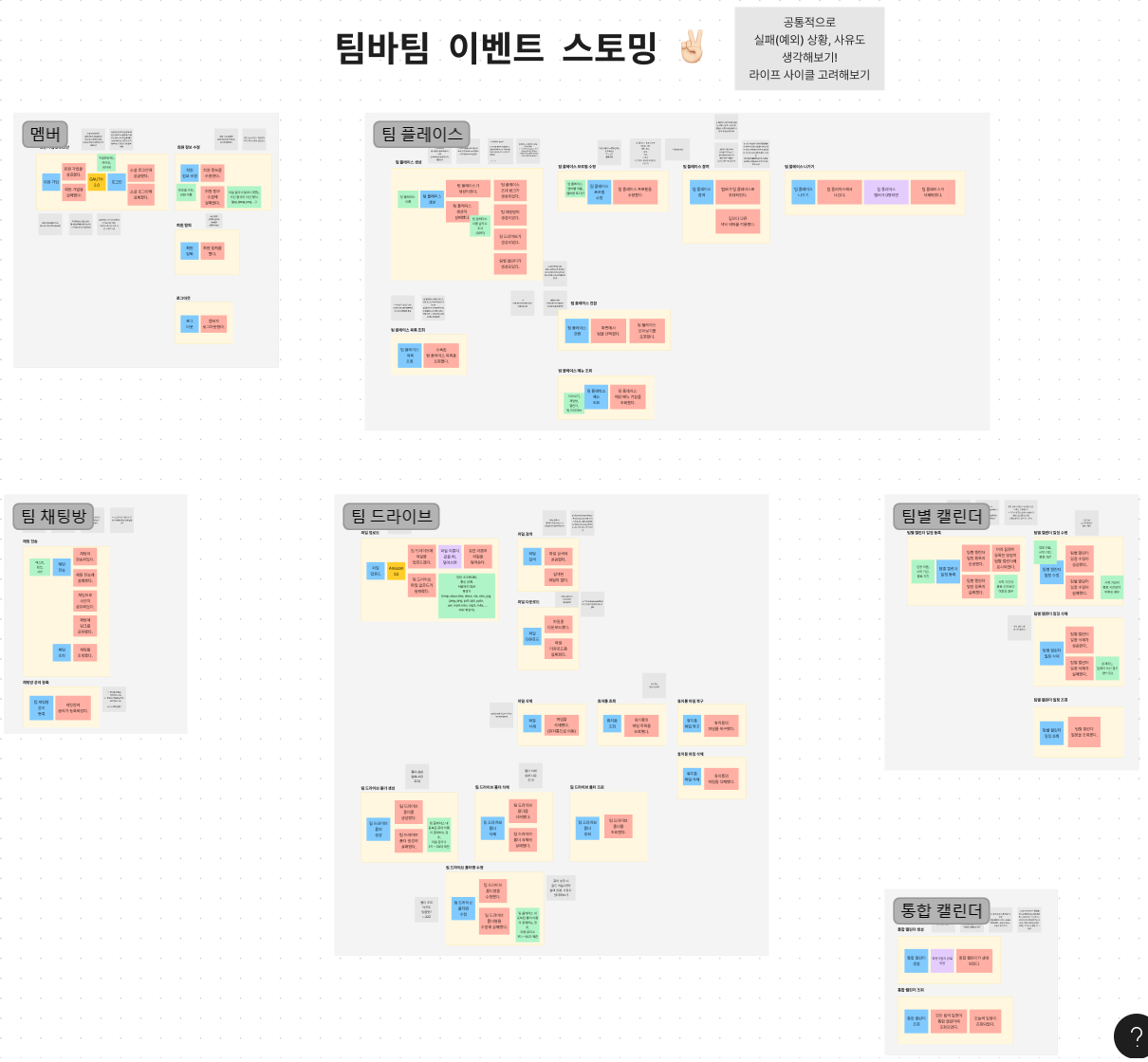 지난 주에 완성한 이벤트 스토밍의 결과를 잃어버리지 않고 자주 확인할 수 있게 온라인 툴인 FigJam으로 마이그레이션 했다. 진행하며 또 다시 든 의문들과 세부사항을 팀과 함께 정했다. 여러번 조정을 하지만 이야기를 할 수록 모두가 같은 내용을 생각하고 있다는 것이 느껴져 뿌듯했다. 아래는 마이그레이션한 결과! 회색은 궁금증과 그 설명을 적어둔거다.